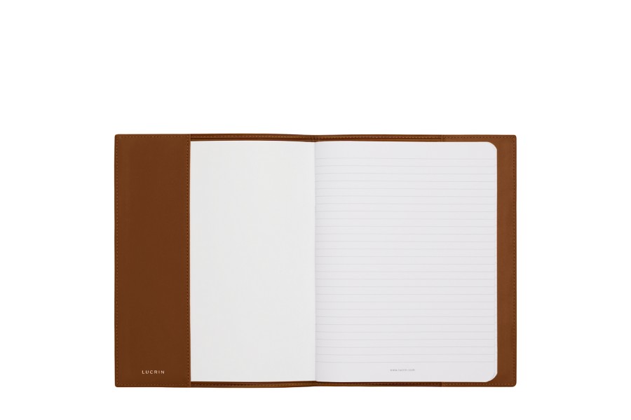 这款 A5 纸大小笔记本(约 50 页)护套,选用优质真皮,美观大方,经久耐用。这款皮套将简单习字簿转变为更为典雅的物件。Lucrin 能工巧匠,运用专业技艺,精心制作,经久耐用。每侧有两条皮革束带稳固习字簿,可轻松放入硬质护套。
