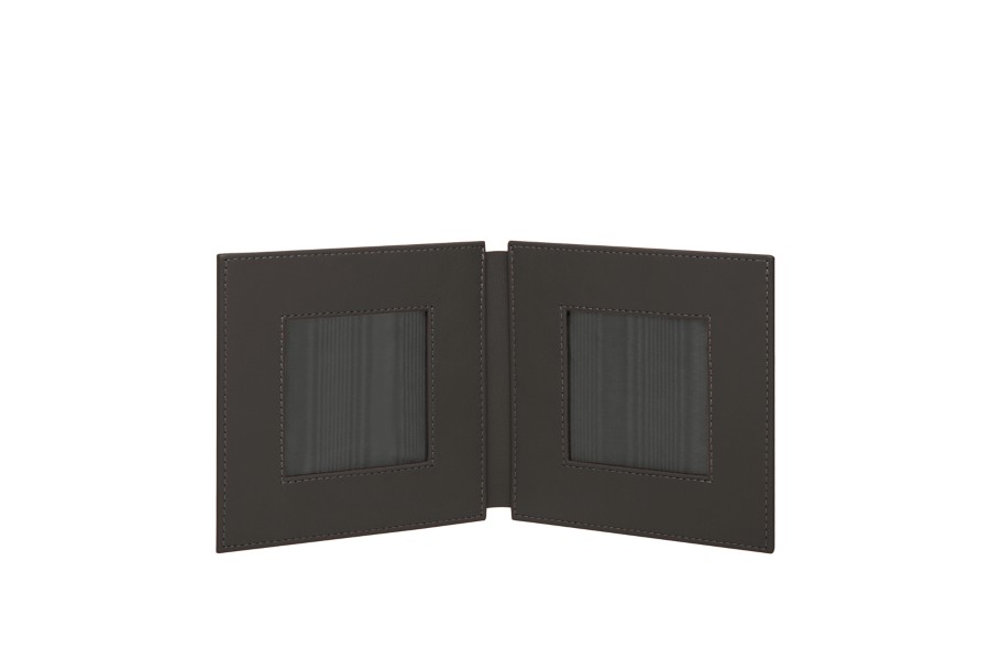 Crafted from high-quality leather, this double picture frame is the ideal accessory to highlight your favourite photos. It will have no trouble finding a place on your end table, desk, or sideboard. Easy to pack up and transport, the frame can also accompany you on business trips. Slide a photo of your loved ones into each side and keep them with you no matter where you're working. Both photos are protected by a flexible transparent plastic pane.